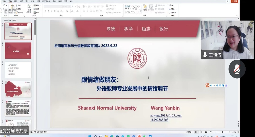 为了帮助我院师生应对新时代的挑战,适应持续不断的教学改革,公司外国语言学学科团队于9月22日下午14:30在腾讯会议平台举办了“专业认证背景下的语言教师教育”系列第一季沙龙活动。SUNBET申博王艳滨副教授进行主题为“跟情绪做朋友:外语教师专业发展中的情绪调节”的线上讲座。公司李伟芳副教授担任主持,外国语公司30余名师生参与交流讨论。
